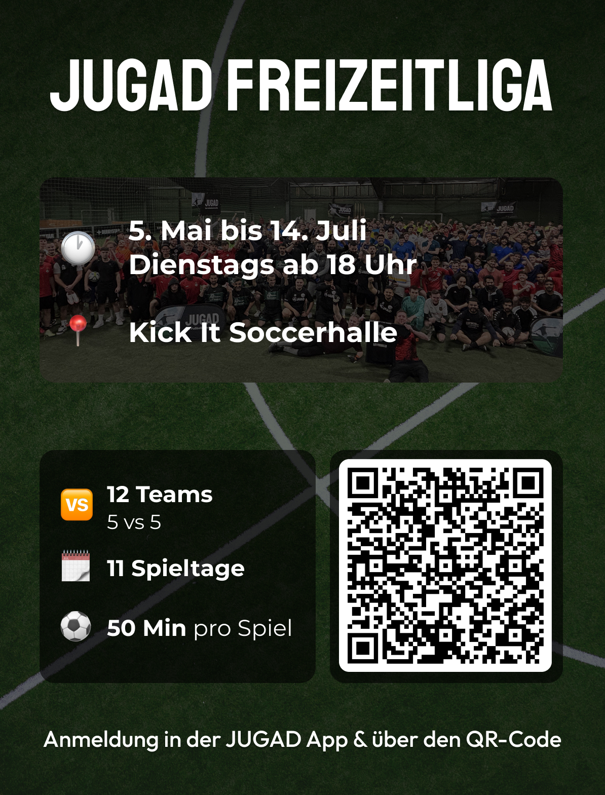 Gespielt wird vom 5. Mai bis zum 14. Juli jeden Dienstag in der Kick It Soccerhalle. Durch die Soccerboxen bleibt der Ball durchgehend im Spiel. Jedes Spiel geht 50 Minuten 🔥