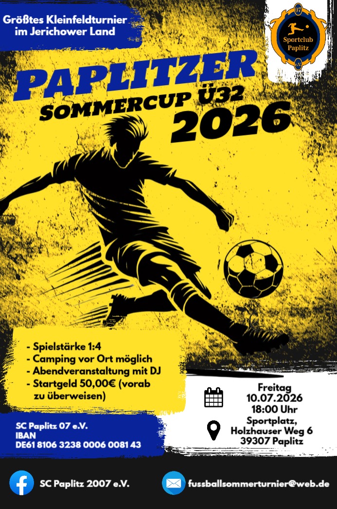 wir veranstalten unser 17.Fußballkleinfeld - Sommerturnier vom 10.07.-12.07.2026 in 39307 Genthin OT Paplitz. Letztes Jahr haben 40 Teams aus 10 verschiedenen Bundesländern teilgenommen. Spielstärke 1:4 + Wechselspieler. Gespielt wird auf 4 Rasenplätzen. Das Fußballspielen ist an diesem Wochenende eher Nebensache, denn alle Teams haben die Möglichkeit zum Zelten und können an zwei tollen Abendveranstaltungen mit Musik und der einen oder anderen Showeinlage am Freitag und Samstag als Mannschaft zusammenwachsen. Das gute Verhältnis zwischen den Mannschaften ist immer wieder bemerkenswert. Unser Event nutzen viele Vereine, aber auch etliche Freizeitteams als Saisonabschlußfahrt oder auch als Start zur Saisonvorbereitung. Fragen beantworten wir Euch sehr gerne telefonsich. Wegen der Weltmeisterschaft ist außerdem ein Public Viewing geplant. Wer bei Facebook vertreten ist, kann außerdem zahlreiche Bilder der letzten Jahre begutachten.